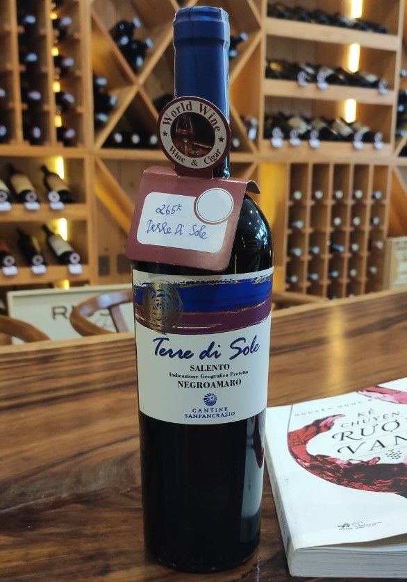 Đặc điểm: Rượu vang Terre di Sole được làm 100% từ giống nho Negroamaro, có độ tuổi trung bình trên 30 năm tuổi. Được mệnh danh là chai vang ngon chất lượng giá thành chưa đến 300 nghìn đồng, được xếp trong top những chai vang ngon giá rẻ của Ý.